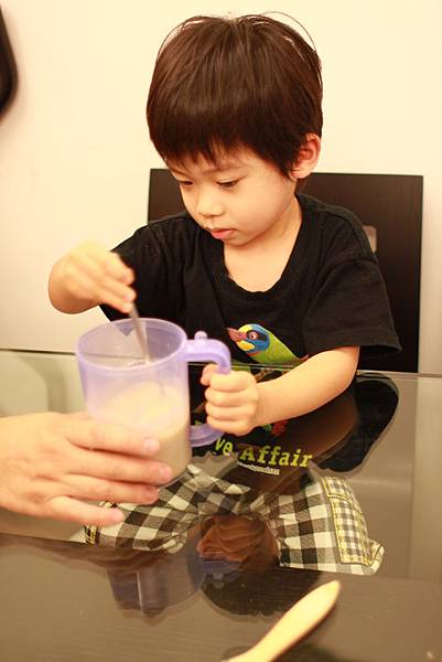 爸比先幫鏞鏞調好雞蛋糕的材料