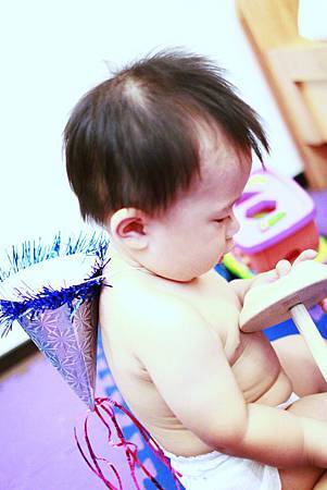 拍照完的甫府似乎對於那頂花俏的生日帽感到不耐煩