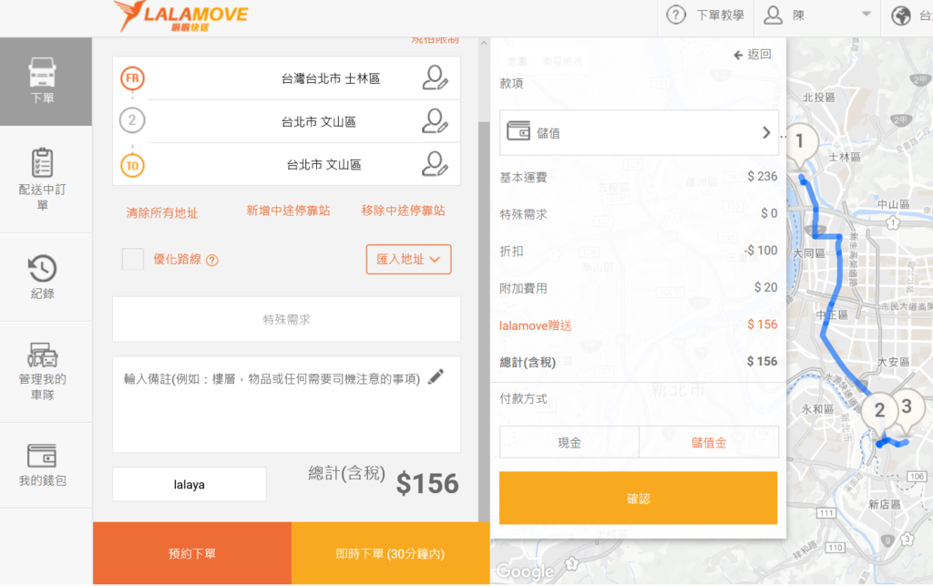 值得表揚的是~~【Lalamove啦啦快送】可以"一次運送好幾個地點"(專有名詞稱為"新增中途停靠站")