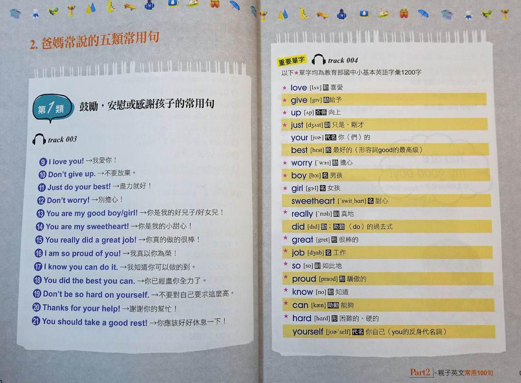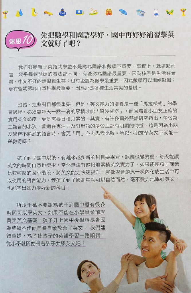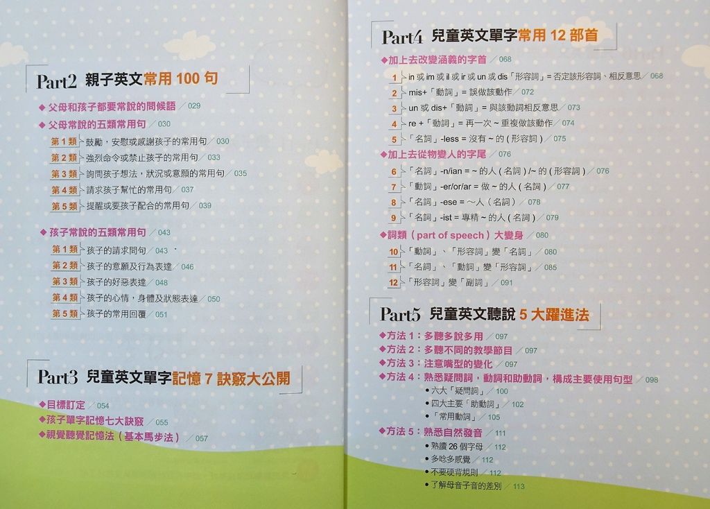 書籍內容除了矯正家長的觀念,也涵蓋在小學階段甚至國中階段需要學習的單字、句型、文法