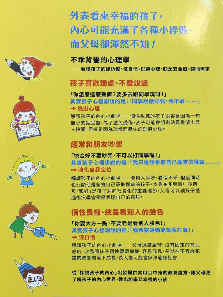 書中針對各種情緒的孩子,做最深入的解析,是在探索孩子內心,更是在引導家長使用正確的方式教育孩子
