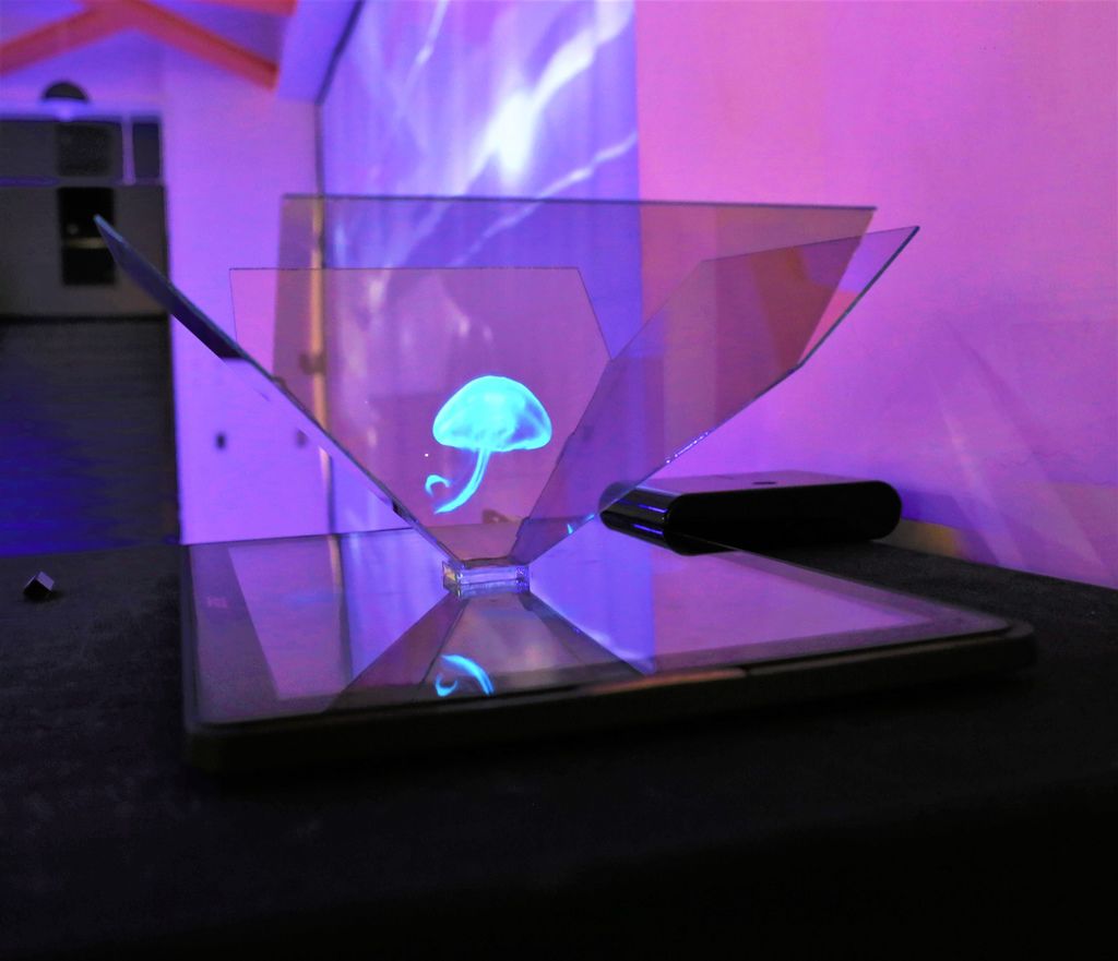 現在將完成的作品影像,放入平板中,就能投射在"立體水族箱"了