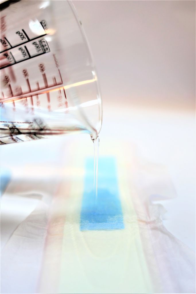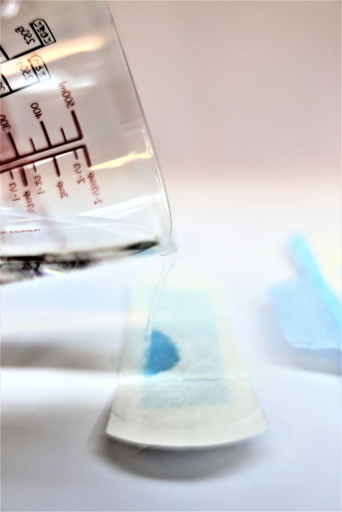 再把水倒入夜用型衛生棉,咻的一下,馬上就吸收了