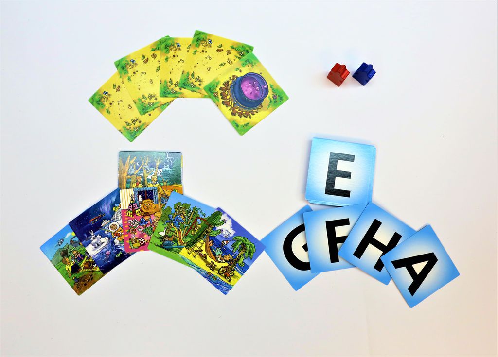有藍色魔法師與紅色女巫、字母卡、路徑卡、終點紫色大鍋卡、場景題目卡