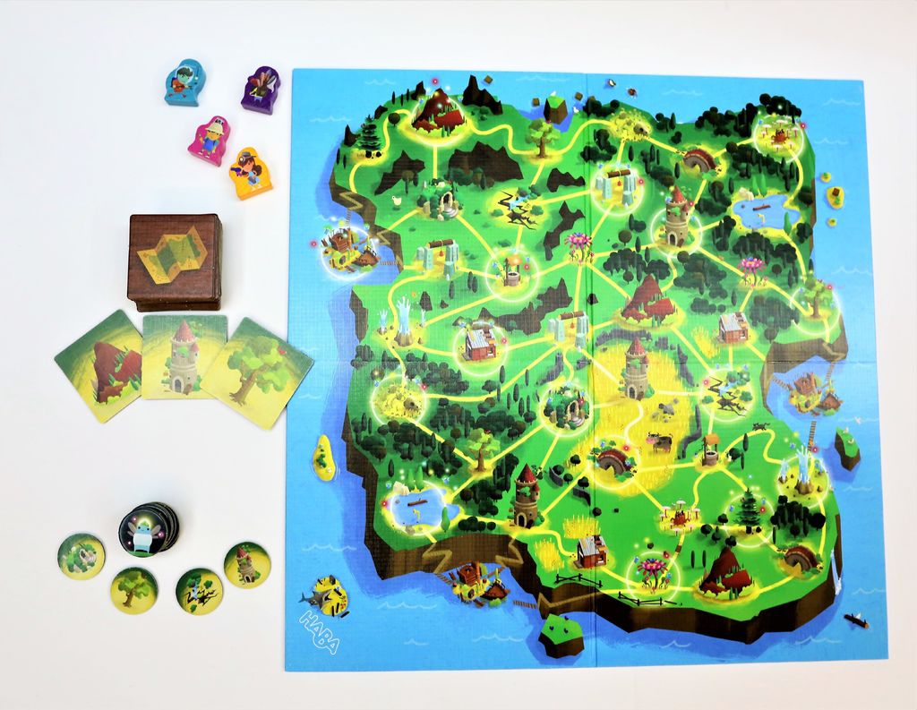 遊戲配件有頭巾、磁鐵、綠色寶石、題目卡