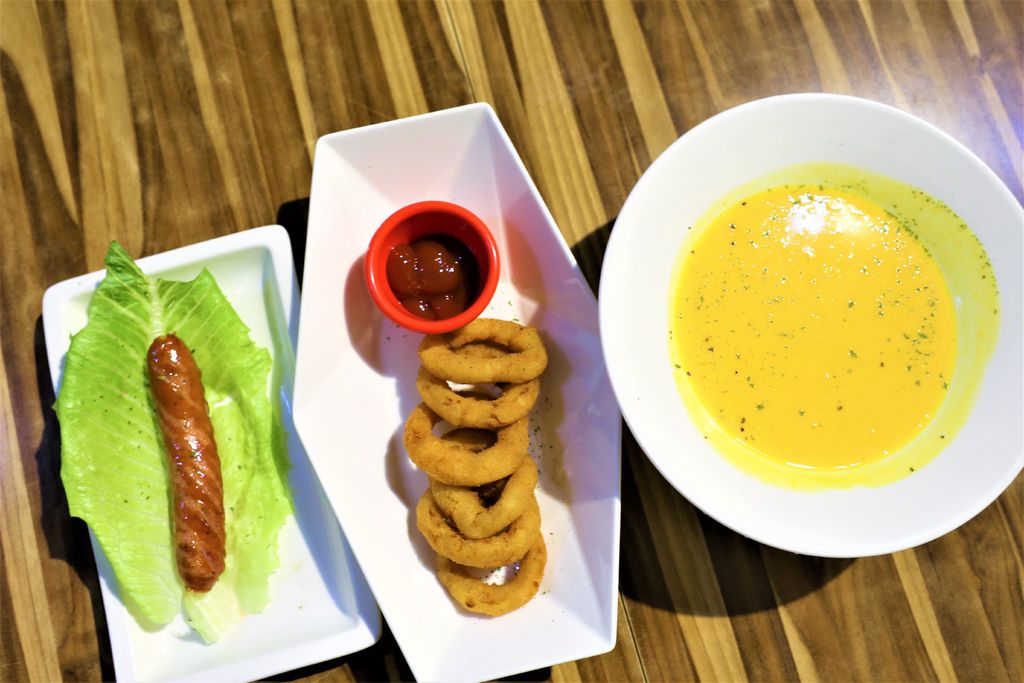 不一會兒,湯品和炸物就上桌了。南瓜濃湯好香好濃,味道非常棒,洋蔥圈和德式香腸也非常可口,孩子吃得好開心