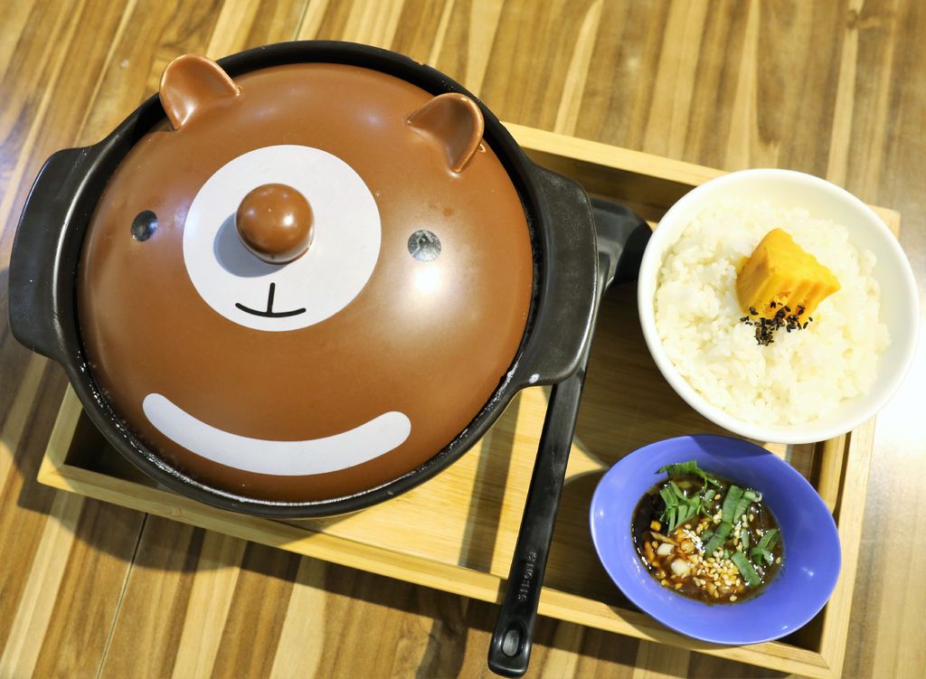 高麗菜、木耳、香菇、金針菇、梅花豬肉片、魚板、鑫鑫腸、青江菜(隨季節變換),可以搭配地瓜飯或冬粉二選一