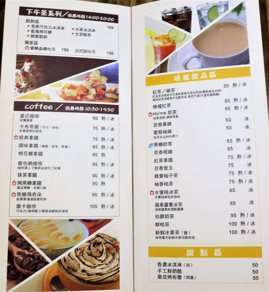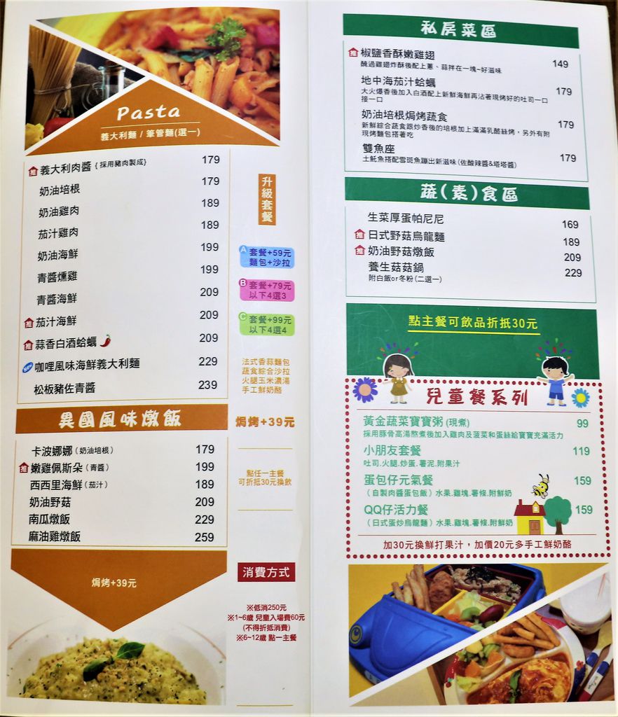 餐點價格平實,有低消,不收取服務費,所以感覺很優惠喔。來看看菜單,完全可以用琳瑯滿目的餐點來形容啊~