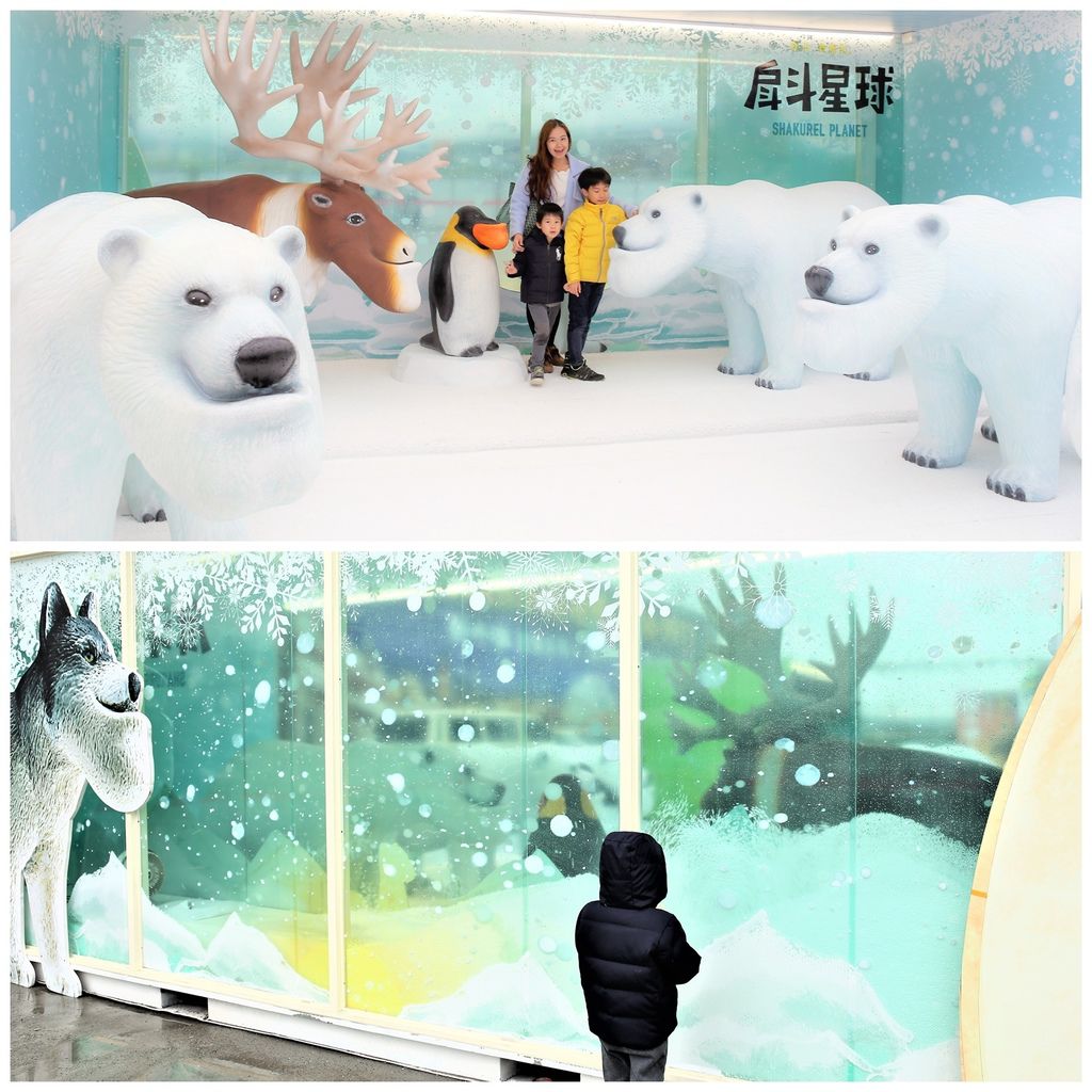 這座北極圈概念的星球,後方還有密閉式的飛舞雪花,沒去北極,來這裡拍拍照也有身歷其境的感覺,好夢幻
