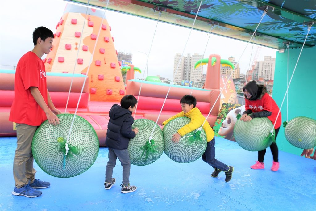 闖關玩遊戲也好有趣,有叢林攀球氣墊區和大球遊戲,都充滿動感