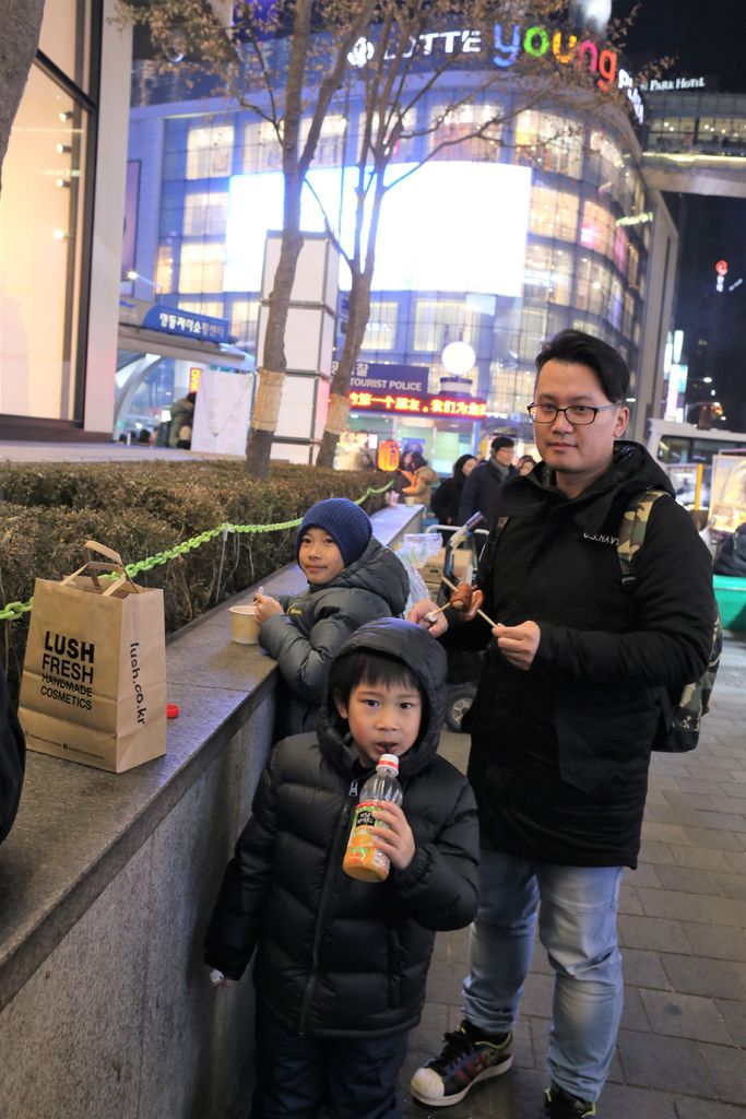 明洞的小吃攤很多,一家人就在這裡吃東吃西,逛東逛西
