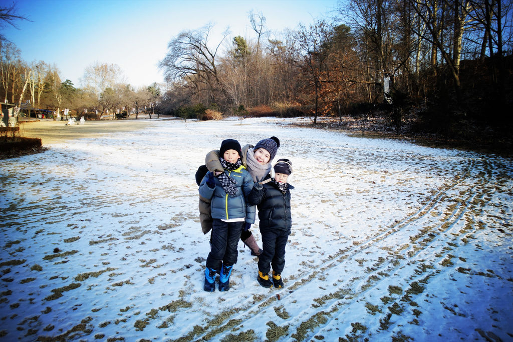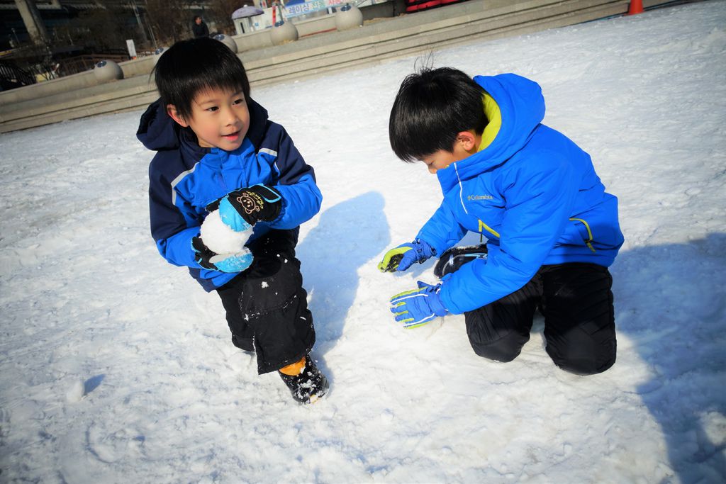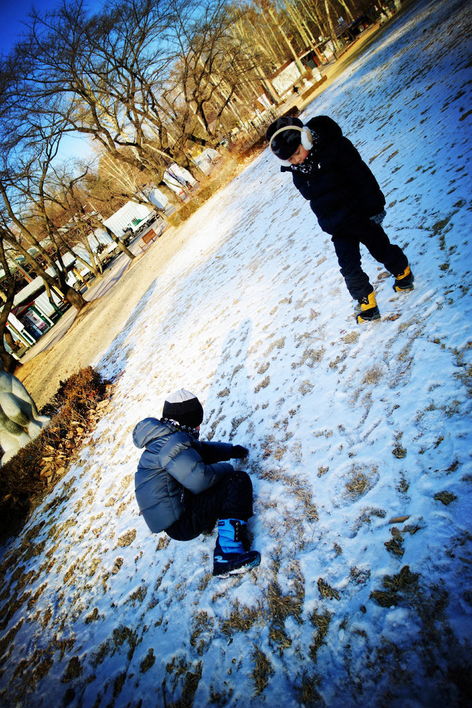 還堆起雪人來了,媽咪則是遠望漢江的冰湖,享受美麗的景色