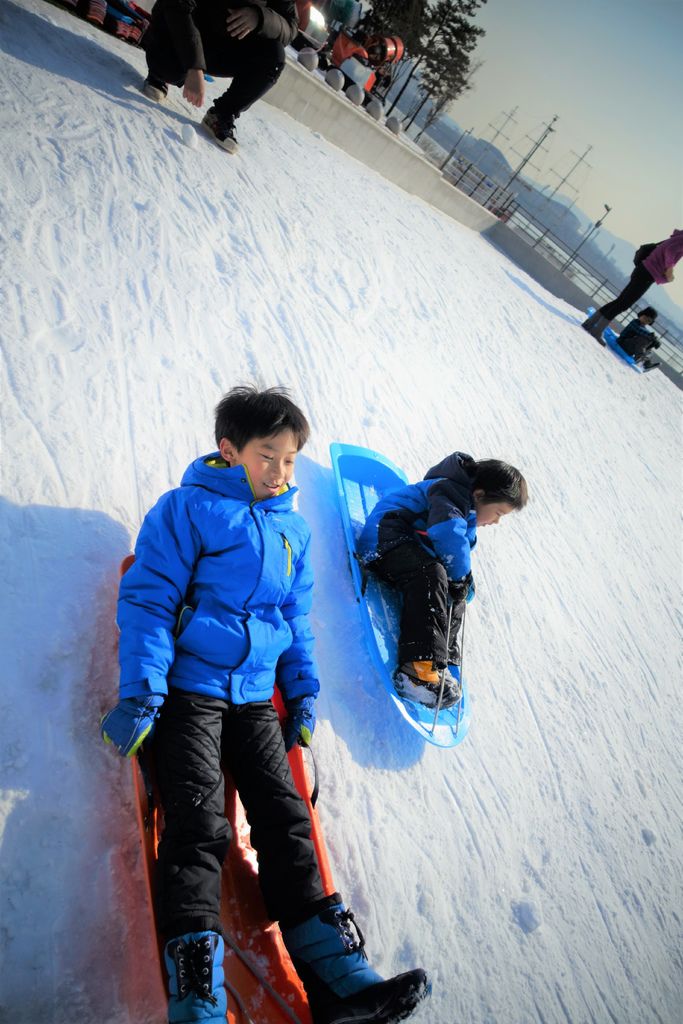 彌補昨天在橡樹谷玩不過癮的雪盆,在纛島漢江公園雪橇場兩兄弟玩得好開心