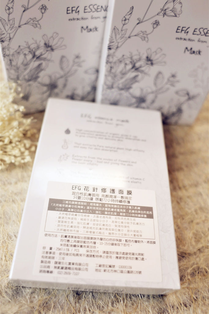 【EFG花針修護面膜】是我最近使用的一款面膜,一開始會注意到它,就是這特別的名字,很想感受一下什麼是"花針修護"的效果