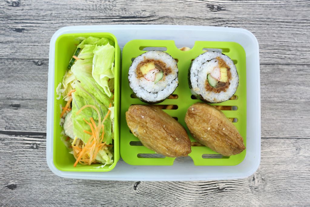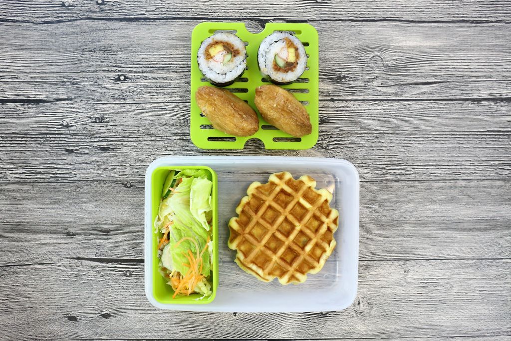 另外,兩層式設計的早午餐盒也好實用,上層我放壽司,下層放鬆餅、還有綠色方格層可以放置新鮮沙拉