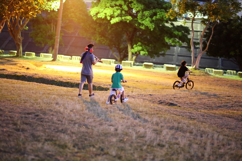 夏天的傍晚,全家人就在堤防附近騎腳踏車,親子一起騎車,真的很愜意啊!