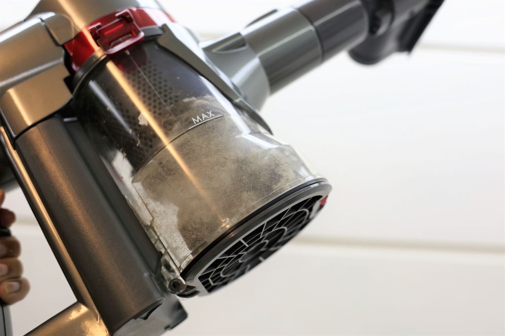 而這款集塵桶的開啟方式是打開左右兩邊的開關,在向上開啟,雖然不是那種所謂的「一鍵就開、不沾手清潔灰塵」的設計