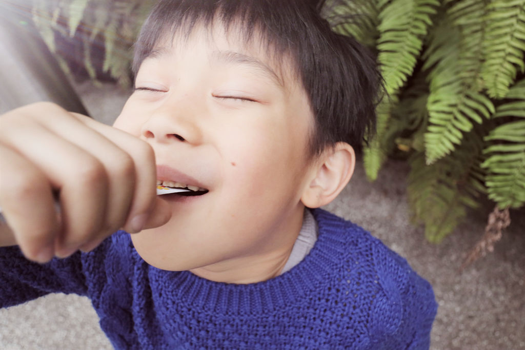 因為有點顆粒,小小孩知道要「嚼一嚼」,不會有被粉末嗆到的問題,小小孩吃起來也安全多了