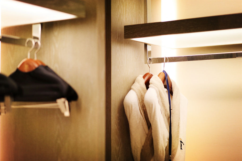 房間設備齊全,有獨立寬敞更衣間、床頭控制面板、獨立冷暖空調控溫裝置、保險箱