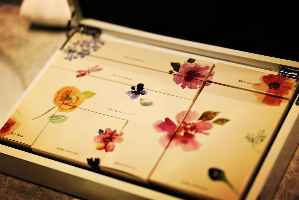 盥洗盒上的妝點也都是古色古香,外盒的台灣藍鵲,是飯店中經常看到的鳥類圖騰