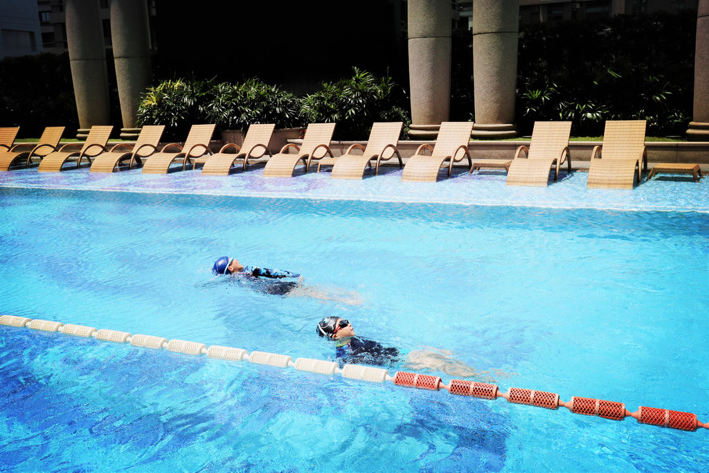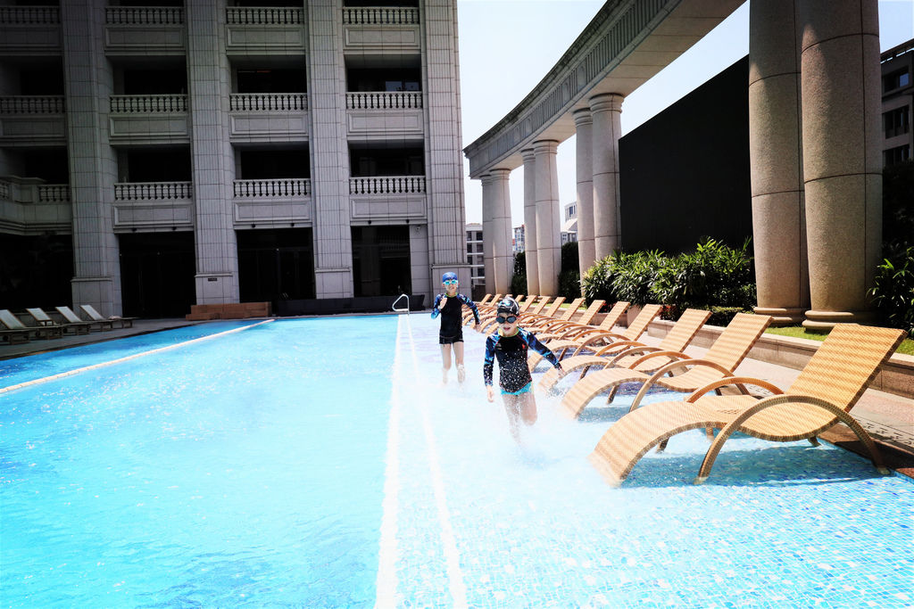 戶外恆溫游泳池溫度適宜,鏞鏞甫甫兩個孩子做完暖身後摸摸水溫,就直接下水,是全年四季都可以盡情暢游的泳池