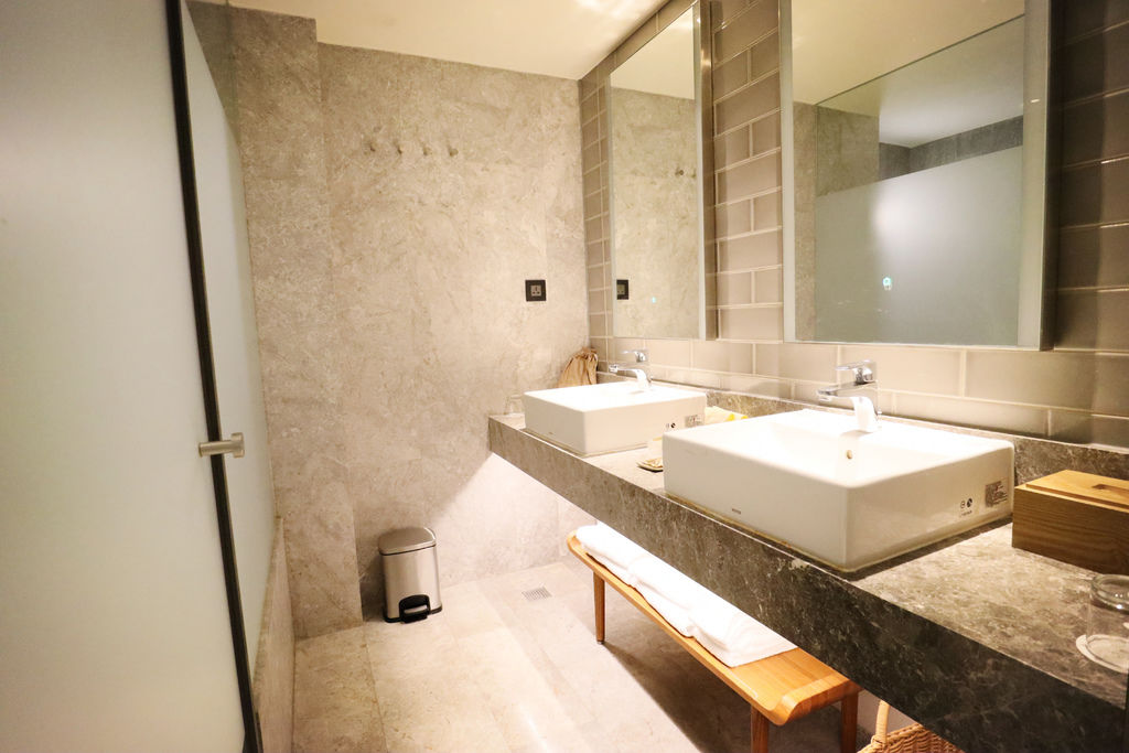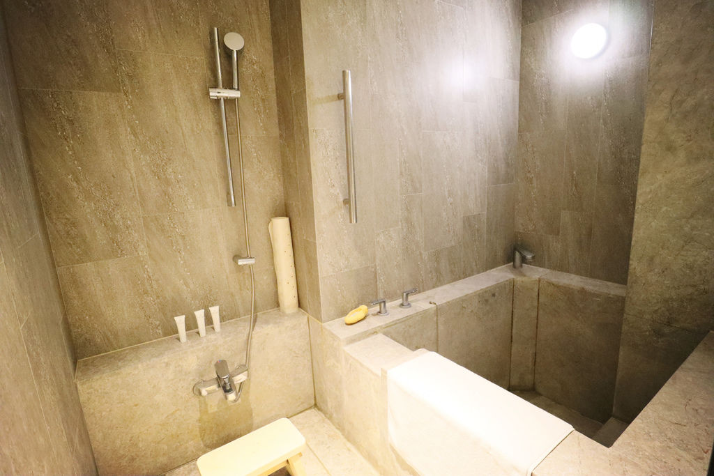 石砌浴缸及獨立淋浴柱,讓泡澡更夢幻了,我也好喜歡酒店獨家的洗沐組合