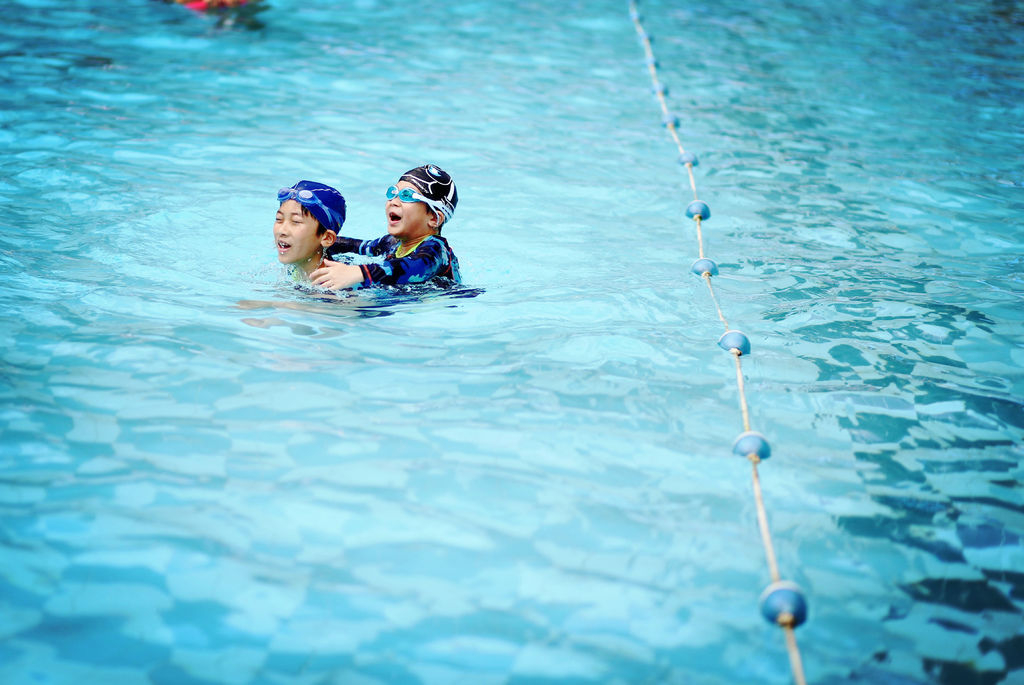 戶外恆溫游泳池溫度適宜,鏞鏞甫甫兩個孩子做完暖身後摸摸水溫,就直接下水,是全年四季都可以盡情暢游的泳池