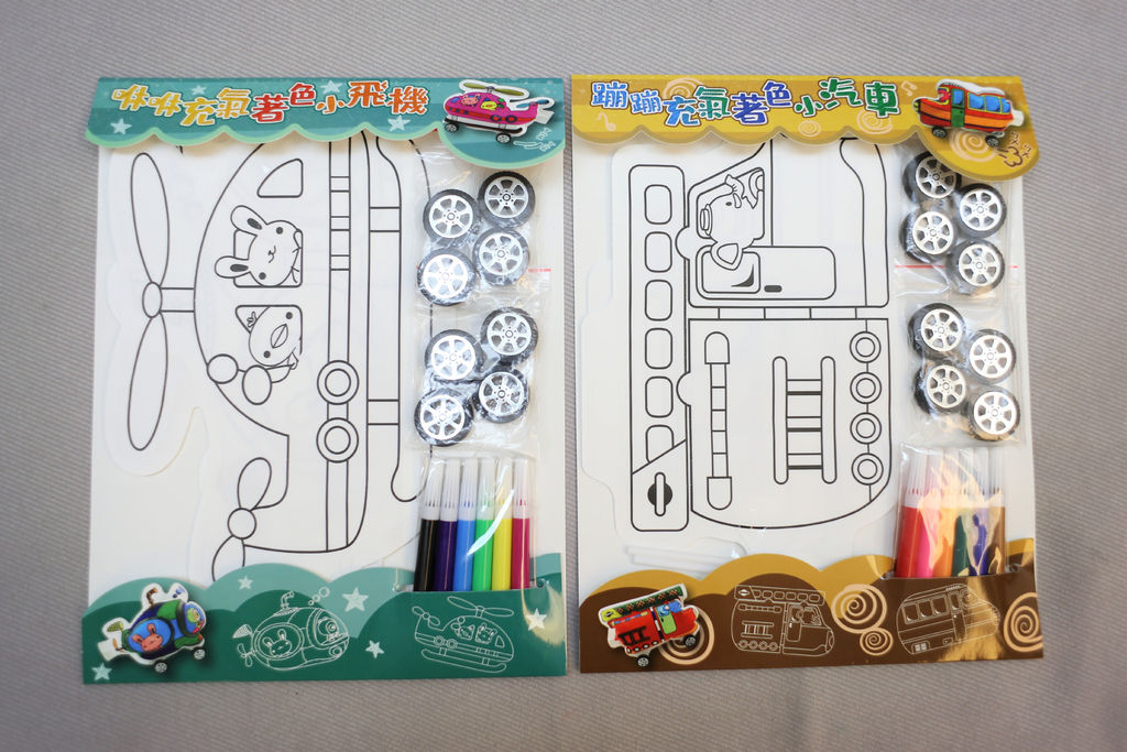 目前有兩款:「咻咻充氣著色小飛機」、「蹦蹦充氣著色小汽車」,都是充氣氣球,也都可以在地上快速行駛喔!