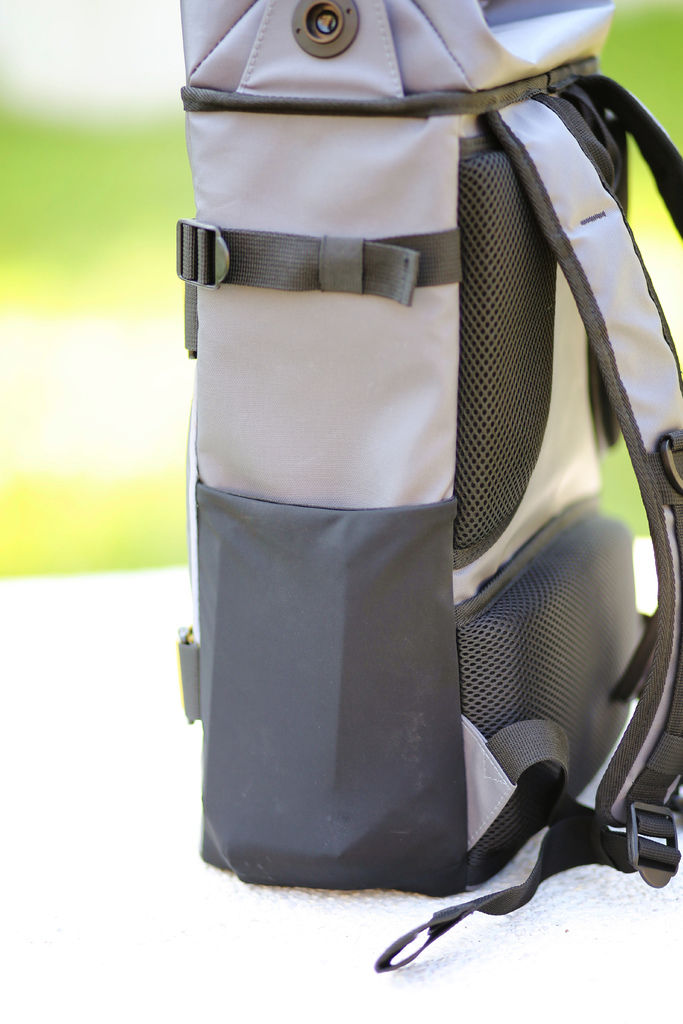 前面設計拉鍊式的收納小袋,左右兩側可以放置水壺、小物