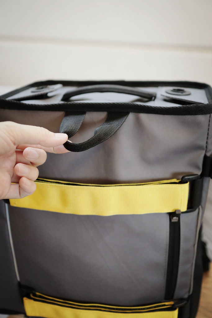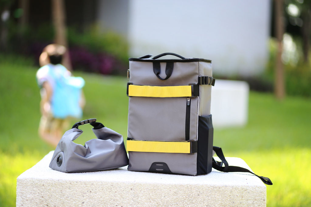手提便當袋的確會讓孩子行動比較不方便,而且也很容易遺失,設計成像背包客一樣往上推疊的方式,雙手空空,怎麼活動都自如!