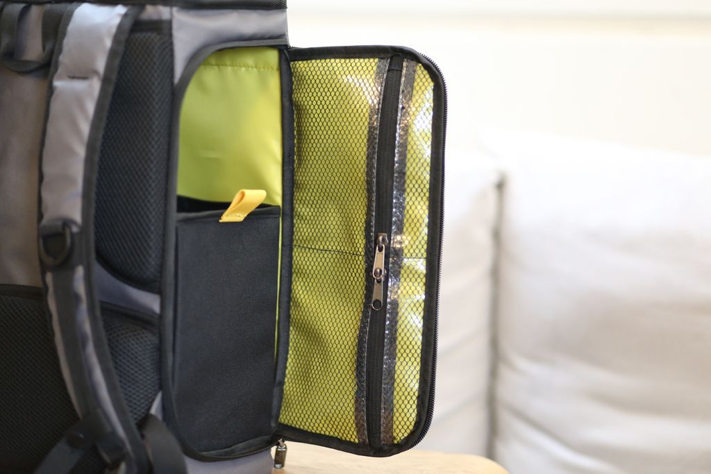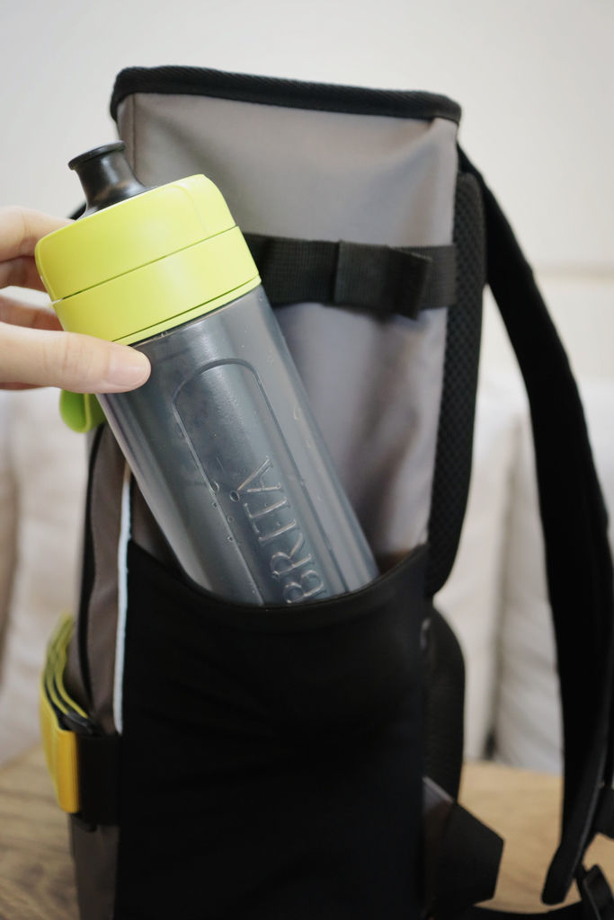另外前方有拉鍊袋、一側設計成可放置500ml左右的水壺袋