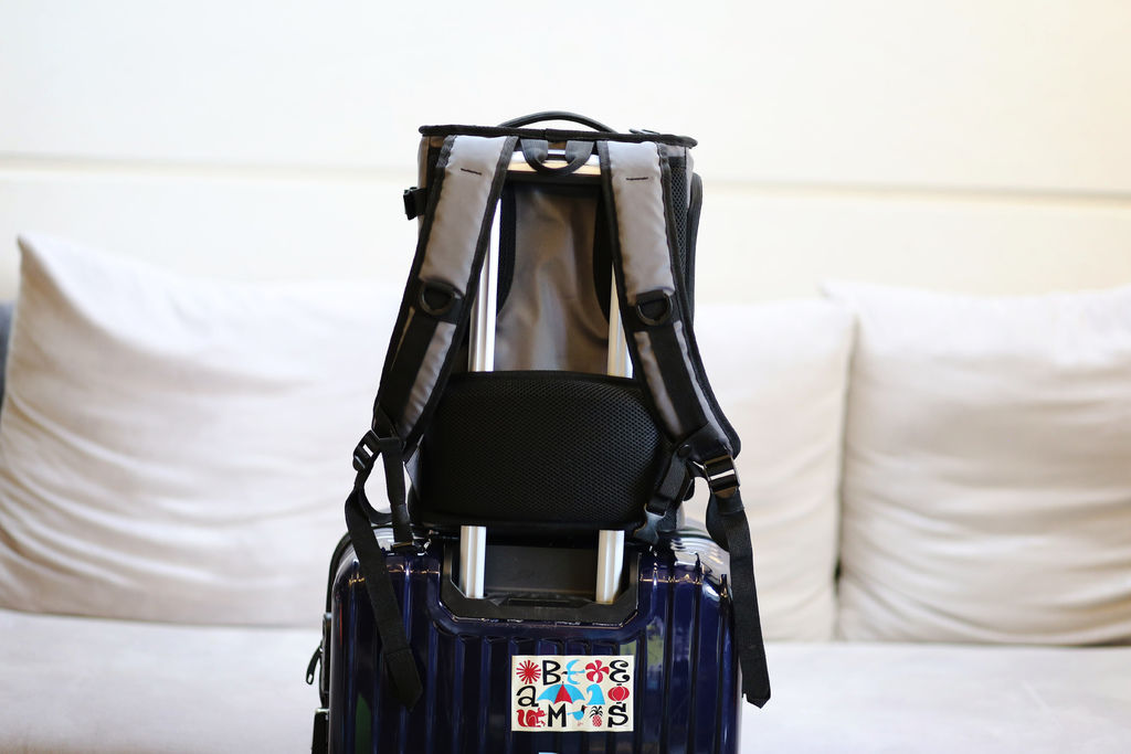 腰墊能穿過行李箱拉桿,所以出國揹 hoppi 真的輕鬆不少,只要一秒架在行李箱就OK了,真的太方便!