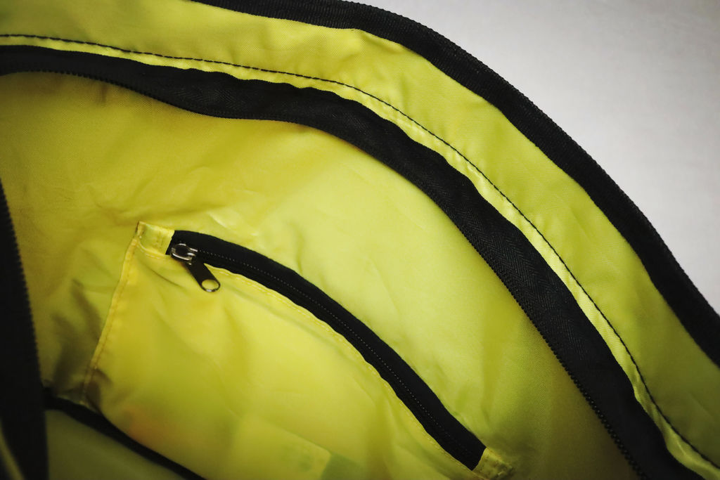 這個子母袋也可能獨立成手提袋,或加裝揹帶成為側揹包,灰黑黃色相間的設計,光是揹這款側背包也很吸睛