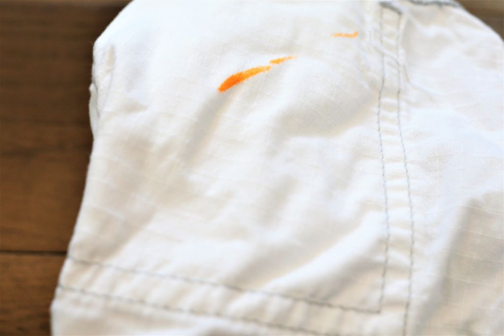 我用白色的外褲來做實驗,沾到了一些橘紅色的顏料,用《私密抗菌衣物手洗精》清洗曬乾之後,會不會有痕跡呢,我們繼續看下去!