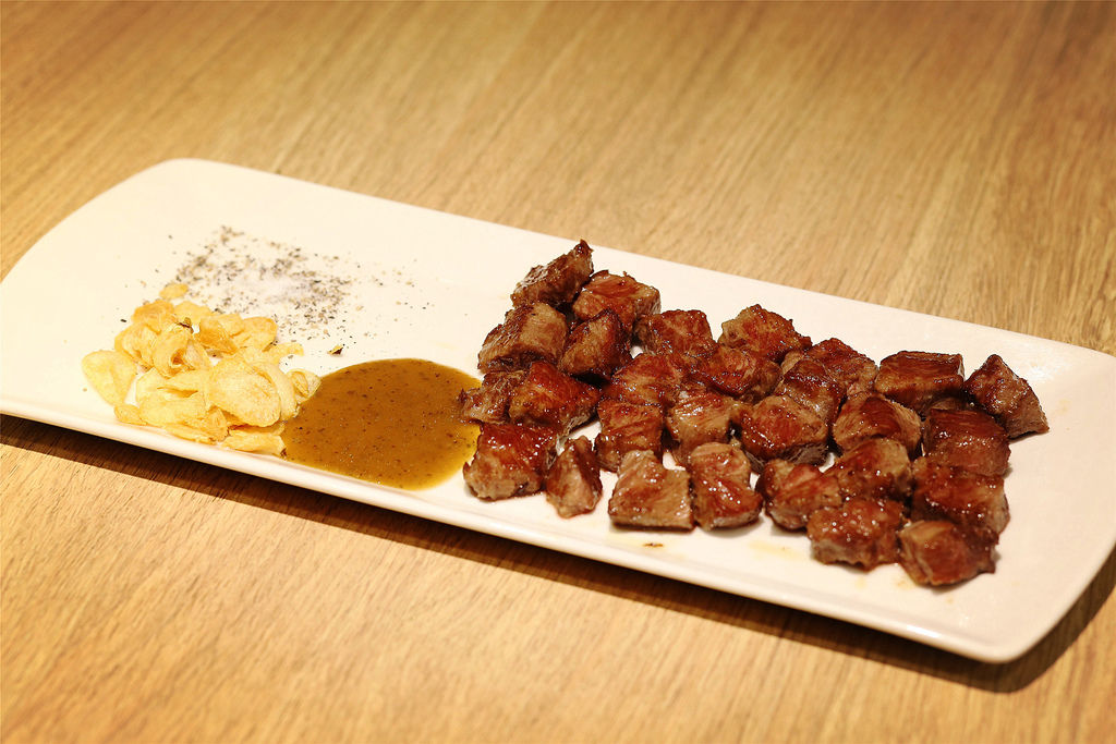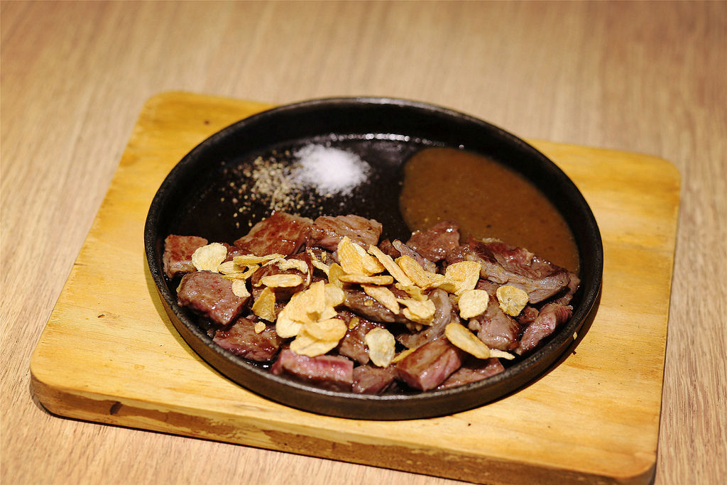 香蒜酥片與現煎原塊牛肉,搭配綠胡椒醬,顛覆傳統鐵板料理的重口味,取而代之的是食材最真實的自然鮮美