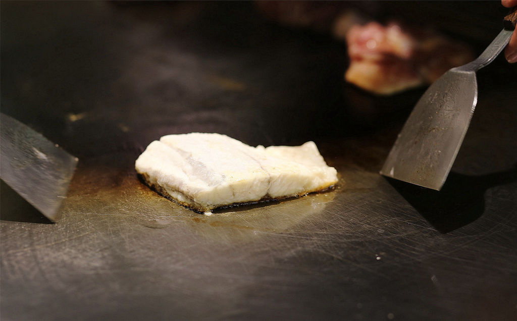 透過清爽調味與鐵板師傅的精湛手藝,把鱸魚煎成帶有點金黃色的光澤,肉質細嫩,又沒有魚刺,軟嫩酥香的風味已是盡在不言中!
