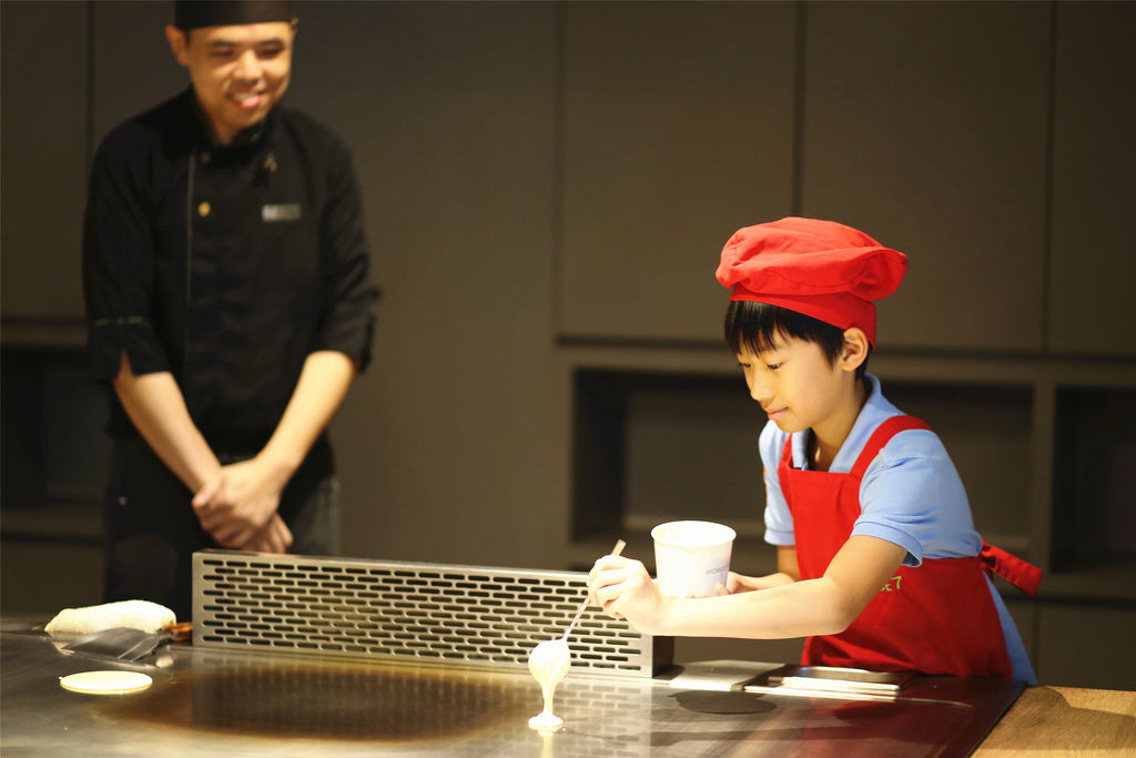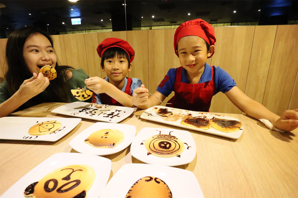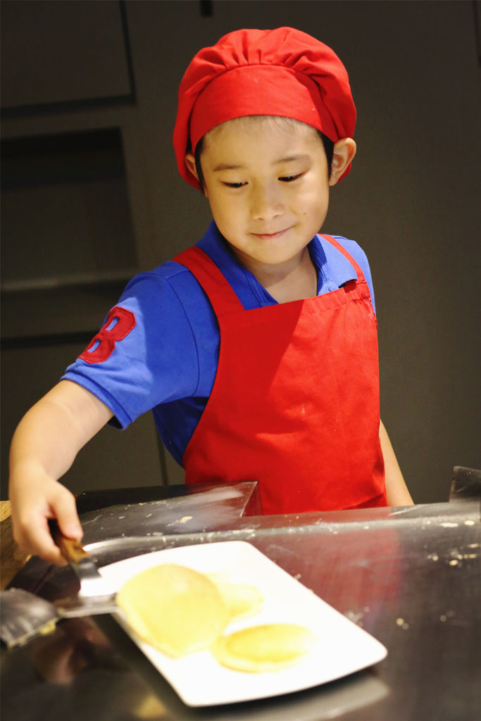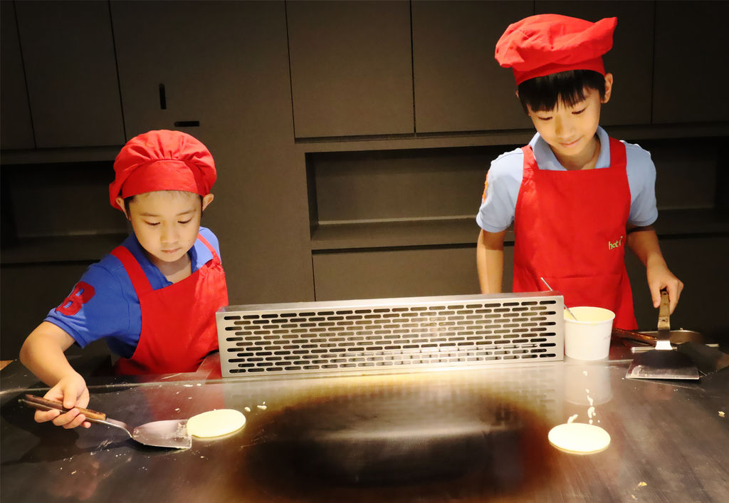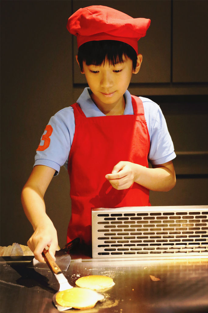 鐵板師傅們這時都化身成親切又有耐心的大哥哥大姊姊,細心指導小廚師們完成銅鑼燒製作的任務
