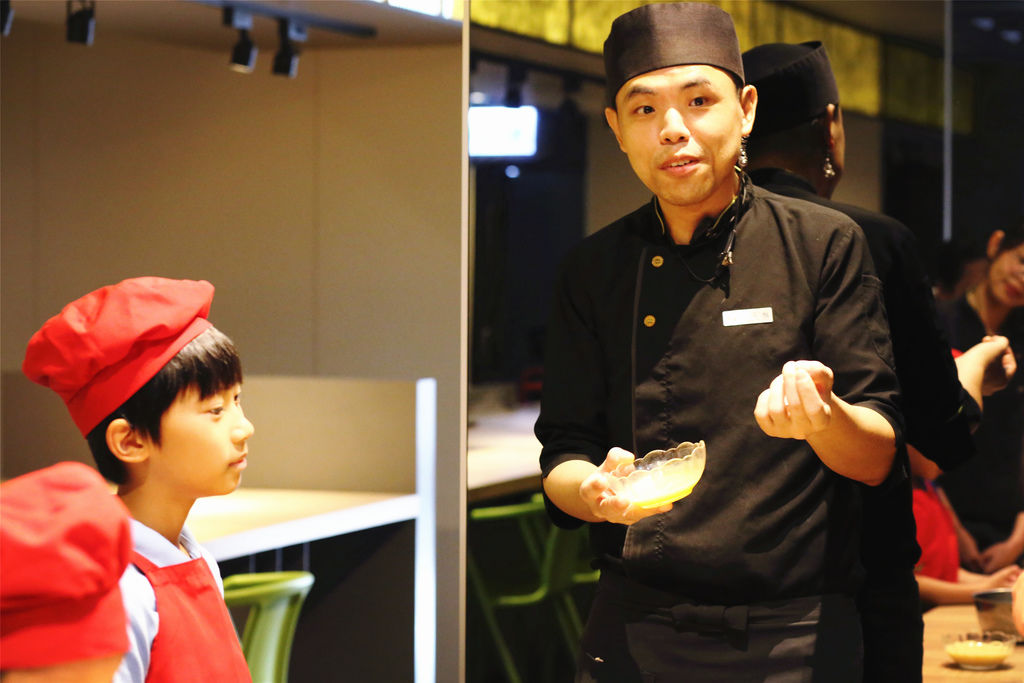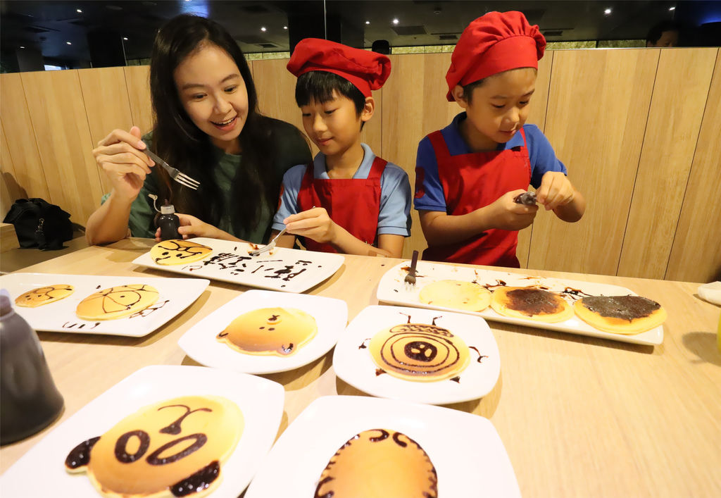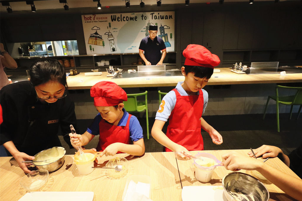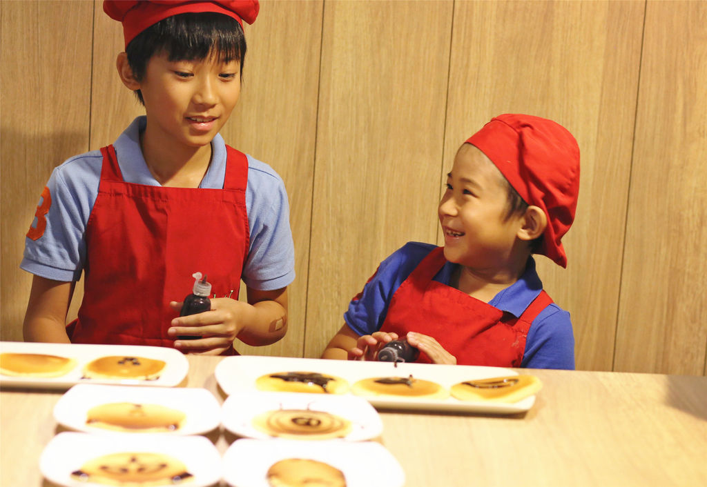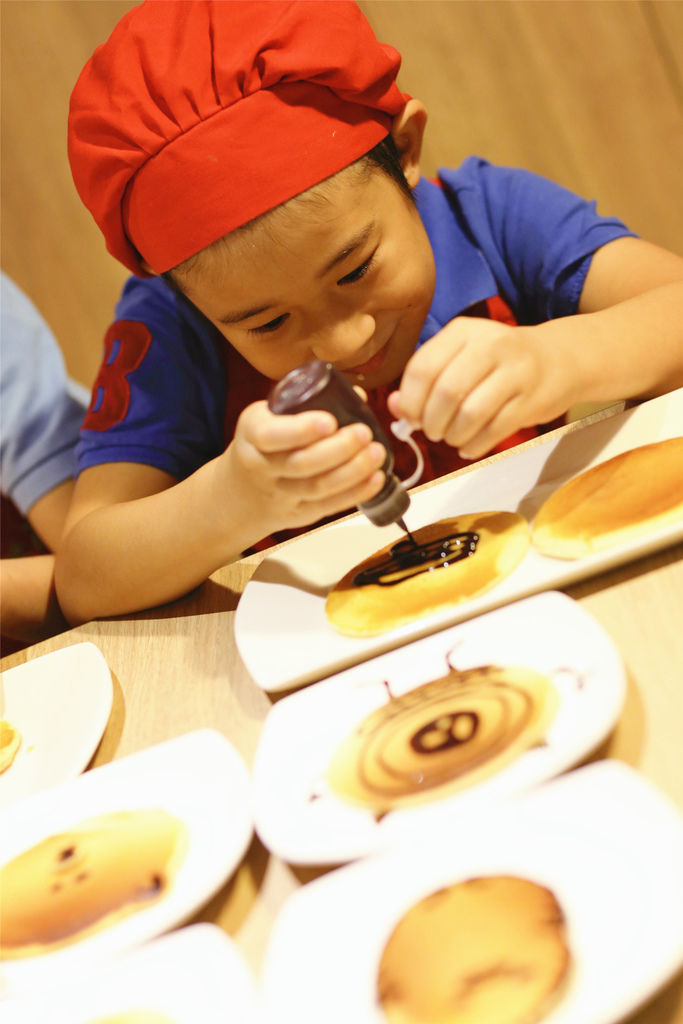 鐵板師傅們這時都化身成親切又有耐心的大哥哥大姊姊,細心指導小廚師們完成銅鑼燒製作的任務