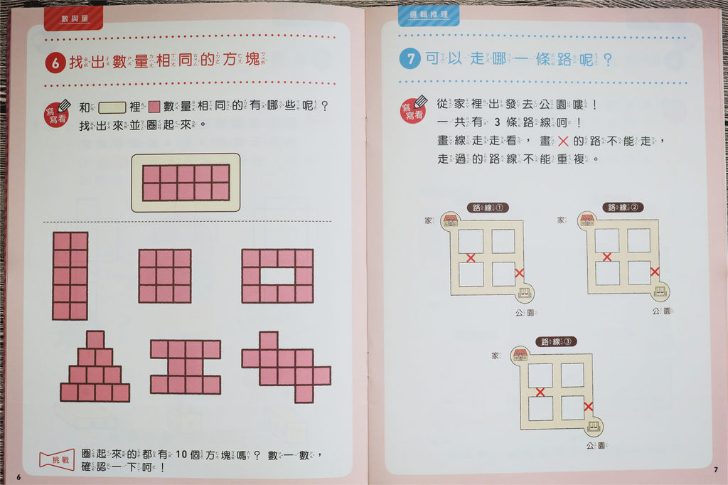 比較特別的是學習版有三本書寫教材,能讓孩子練習更多,像是《思考力UP UP UP》提供多元的思考題型,比方說青蛙和蝌蚪數量哪個比較多? 除了點數之外,一起想想還有什麼方法? 或是進行形狀分類、邏輯推理、圖形空間的思考,這些都有助於孩子邏輯性、思考性更強大喔!