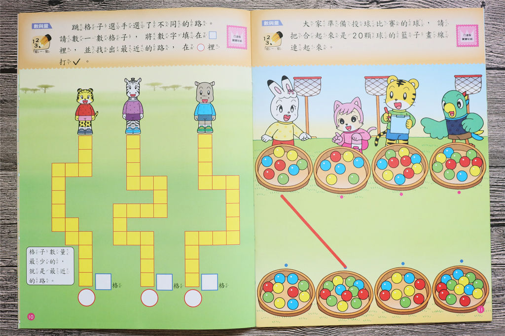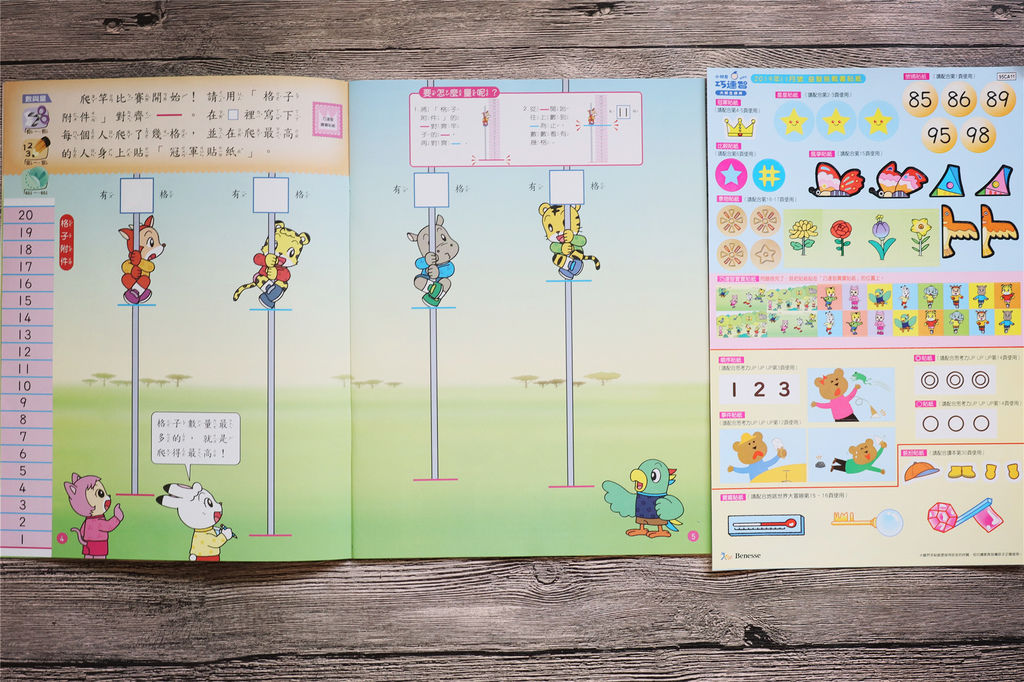 《益智挑戰書+貼紙》是屬於加強數學和專注力的教材,像是以動物運動會爬竿比賽誰爬的最高呢? 來從操作遊戲中學習「三物測量比較」,或是哪兩堆球加起來是20個,建立孩子數與量的概念,同時也有專注力的活動,透過有趣的找人遊戲,來增加孩子的邏輯推理和專注力!