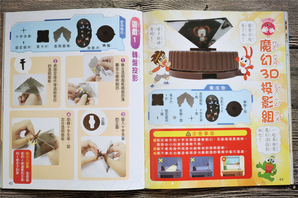 孩子也喜歡書籍中的「科學小創客-魔幻3D投影組」,這是運用透明板、支架與轉盤道具,輕輕鬆鬆就可以DIY動手做出3D投影組,讓孩子透過實際觀察3D投影,真的是很有趣的實驗,甚至還可以搭配手機使用觀看3D影片,原來科學也能那麼好玩有趣!