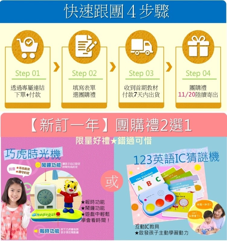 而鏞鏞甫甫親子部落格也爭取到額外的禮物,「巧虎時光機」或「123英語IC猜謎機」好禮二選一,只有這次跟團才有的禮物喔!