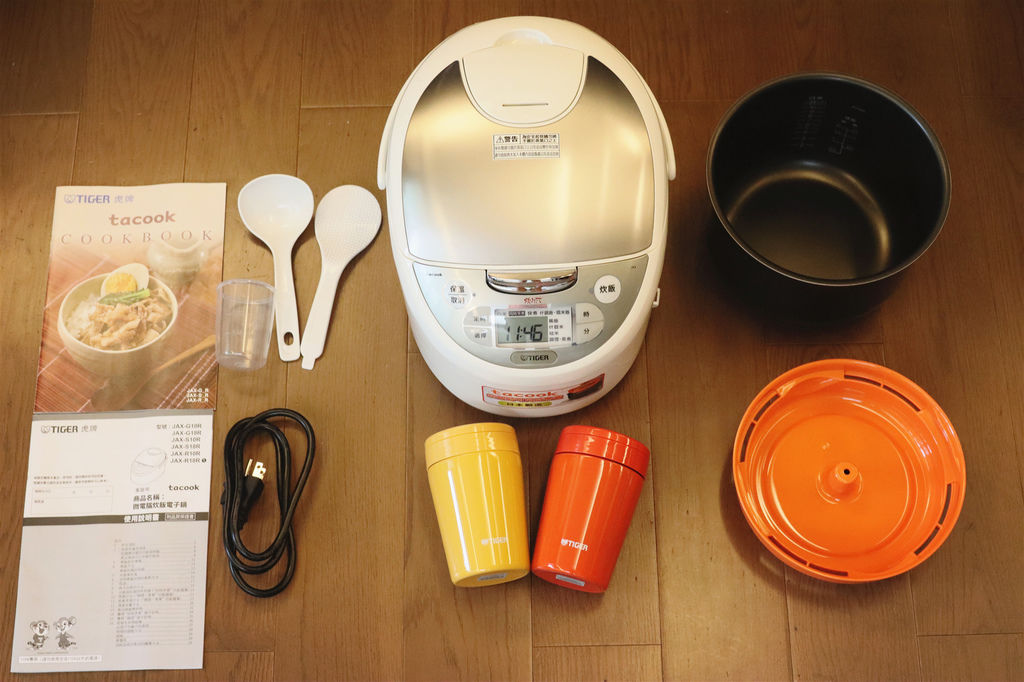 跟個潮流也來個開箱照吧~ 主機、內鍋、調理盤、飯匙、勺子、量杯、食譜、使用說明書(附品質保證書)、電線,還有最下方亮眼的黃、橘兩色不鏽鋼真空食物罐,就是今天要好好分享給大家的廚房好幫手!