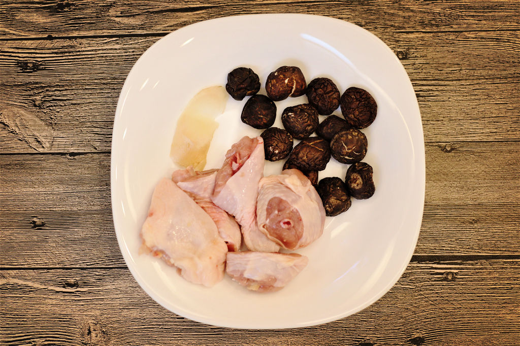雞腿肉100g、香菇數朵、薑片適量、少許鹽