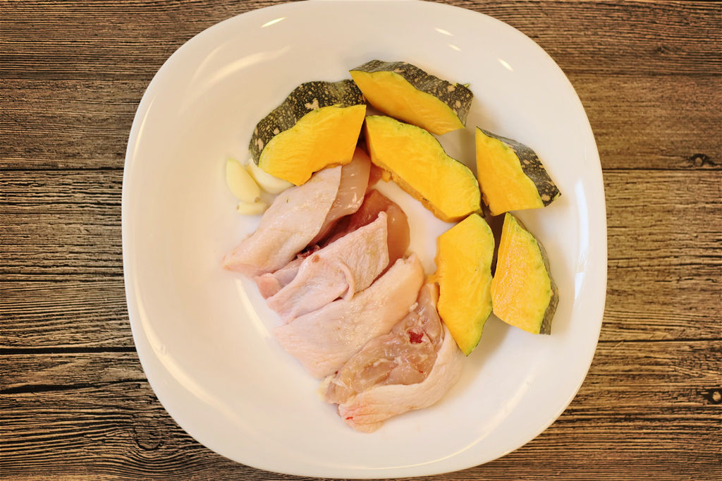 雞腿肉100g、南瓜100gg、鮮奶油適量、蒜頭少許、鹽少許