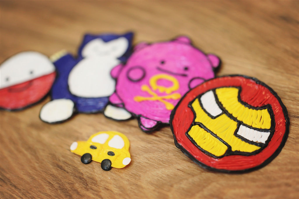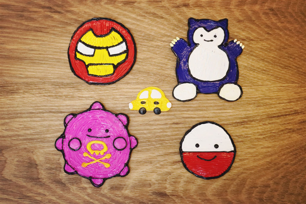 利用不同顏色的搭配,也可以做出多種造型的卡通圖案,加上別針後,就可以變成小朋友最喜歡的徽章,可以別在書包上,擁有獨一無二的徽章很酷哩!也可以利用3D筆將磁鐵黏在作品背後,就可以變成專屬的冰箱貼了!