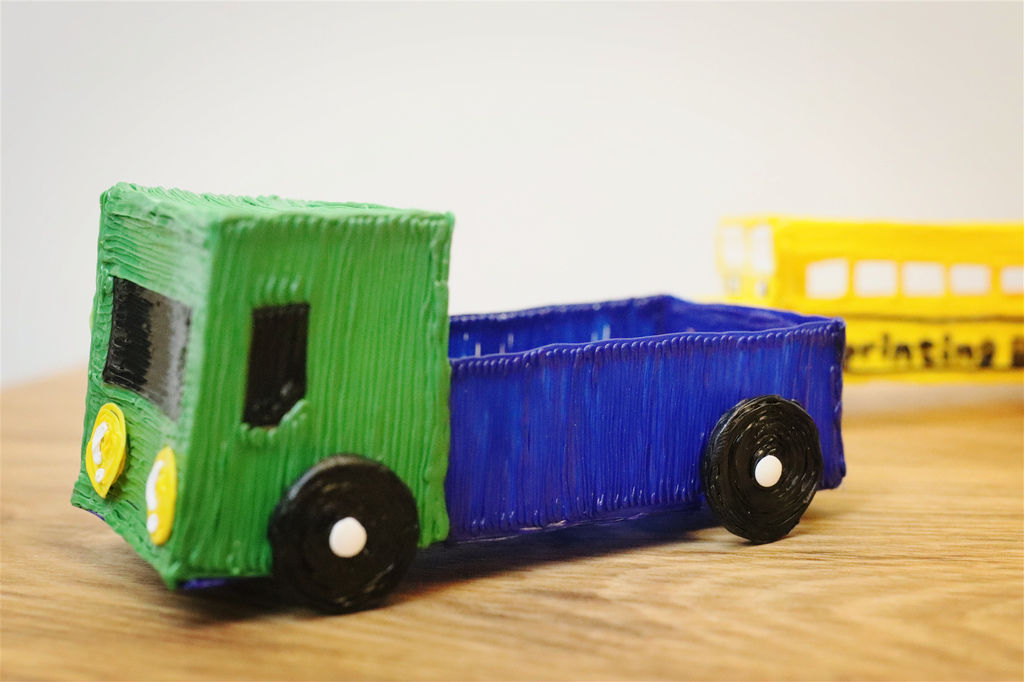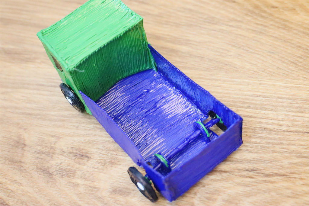 當然也能自己創作出立體的玩具喔! 像是這台用畫出來的車車,有輪子可以跑哩,直接變成玩具,是不是太神奇!