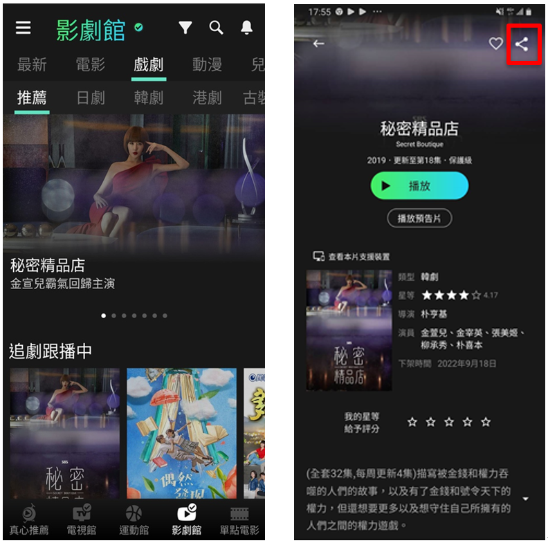 媽咪忙了一天,趁著晚上喝下一杯「戲劇心靈雞湯」,真的很過癮!另外,還可以用《社群分享》功能,推薦最近看到的好片;跟好姊妹、朋友們一起用LINE、FB聊電影、聊戲劇,真是媽咪們的心靈寄託啊!