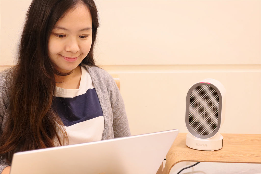 體積雖小,風量卻很驚人! 「對流式循環」的風量範圍大約可以涵蓋整整1~2公尺,個人使用時的包覆性絕對非常足夠,可以從身體到腳都感受到暖呼呼的熱風。也因為有「低音七葉風葉」的七葉排風扇,風量大卻沒有什麼聲音,只聽得見徐徐的風聲,並感受到溫暖的威力,沒有不悅的噪音,所以即使我自己深夜獨自打電腦開暖氣,也覺得很寂靜,設計實在好暖心!
