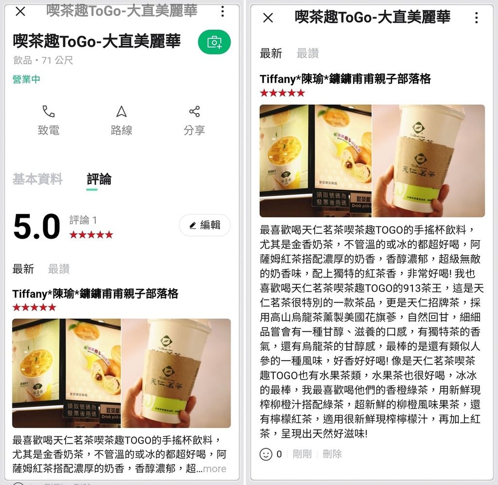 好好喝啊,我本來就好愛喫茶趣ToGo的飲品,忍不住來寫一篇評論告訴大家有多好喝! 不只可以寫評語,還可以給星星,那麼好喝的茶,我給五顆星! 寫完評論上傳之後,還看得到自己的名字,我竟然是這家店的第一個評論者,好榮幸!